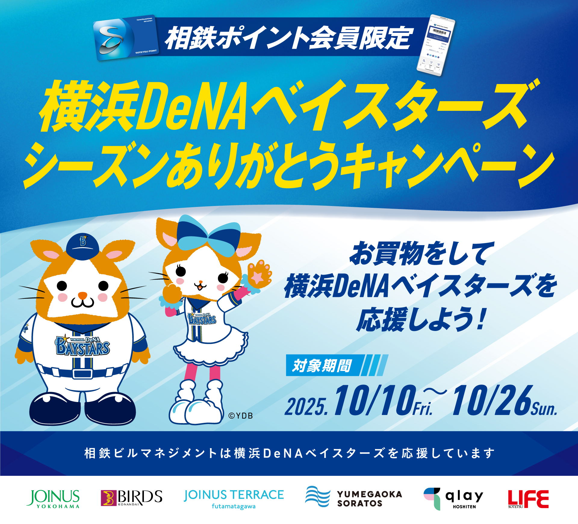 相鉄グループの「相鉄ビルマネジメント」は、同じ横浜を拠点に活躍するプロ野球チーム「横浜DeNAベイスターズ」とスポンサー契約を締結し、2025年10月10日(金)~10月26日(日)の期間、“横浜DeNAベイスターズ応援キャンペーン”を開催します!